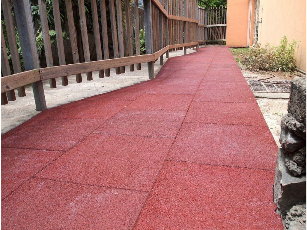Pryž použitá k výrobě této dlažby je speciálně vyvinuta pro vysokou zátěž i při každodenním použití. Má vynikající tlumící vlastnosti a snižuje riziko vzniku poranění. Je vyrobená z recyklovatelného kaučuku, jedná se tedy o ekologický a velice cenově dostupný materiál. Spodní část je vybavena nopovým drenážním profilem, díky kterému dochází k dokonalému odvodu kondenzované vlhkosti i vody. Dlažba Flexi výborně odvádí vodu a neklouže ani v případě přímého deště. Použít jí tak lze na terasy a kolem bazénů. Je plně UV odolná a snadno se čistí.