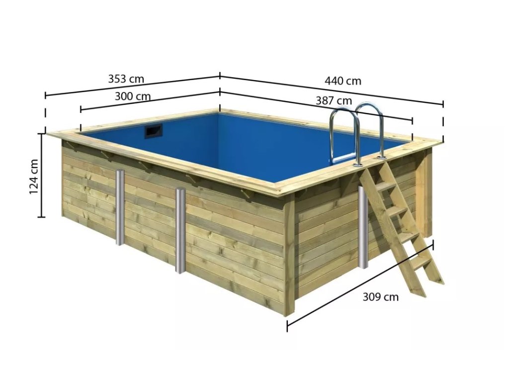 Hledáte dokonalý letní zážitek pro celou rodinu? Pořiďte si bazén KARIBU model 2 a užijte si letní radovánky bez konce, od prémiového německého výrobce Karibu Holztechnik GmbH. Představte si horký letní den, slunce pálí a vy toužíte po osvěžení. S bazénem KARIBU model 2 se váš sen stane realitou. Vychutnejte si chladivou vodu a unikněte letnímu vedru v pohodlí vlastní zahrady. Bazén KARIBU model 2 s rozměry 3,53 x 4,40 m nabízí dostatek prostoru pro hry a zábavu pro celou rodinu. Děti mohou dovádět ve vodě, zatímco vy si budete užívat relaxaci na lehátku s osvěžujícím koktejlem v ruce. Bazén KARIBU model 2 má objem pro cca 12 700 litrů vody a výšku hladiny max. 1,11 m. Obsahem balení je vnější dřevěný žebřík ze severského smrku a žebřík z nerezové oceli vám usnadní vstup do chladné vody. Konstrukce bazénu je z dřevěných profilů se systémem dvojité pero / drážka o síle 44 mm. Vnitřní prostor je vyplněn pevnou modrou PVC fólií o tloušťce 0,6 mm. Speciální tlaková impregnace KDI třídy 4 - bazén lze instalovat do země. Bazén KARIBU model 2 se snoubí s nejlepší funkčností a jedinečným designem. Vyznačuje se vysokou úrovní dílenského zpracování.