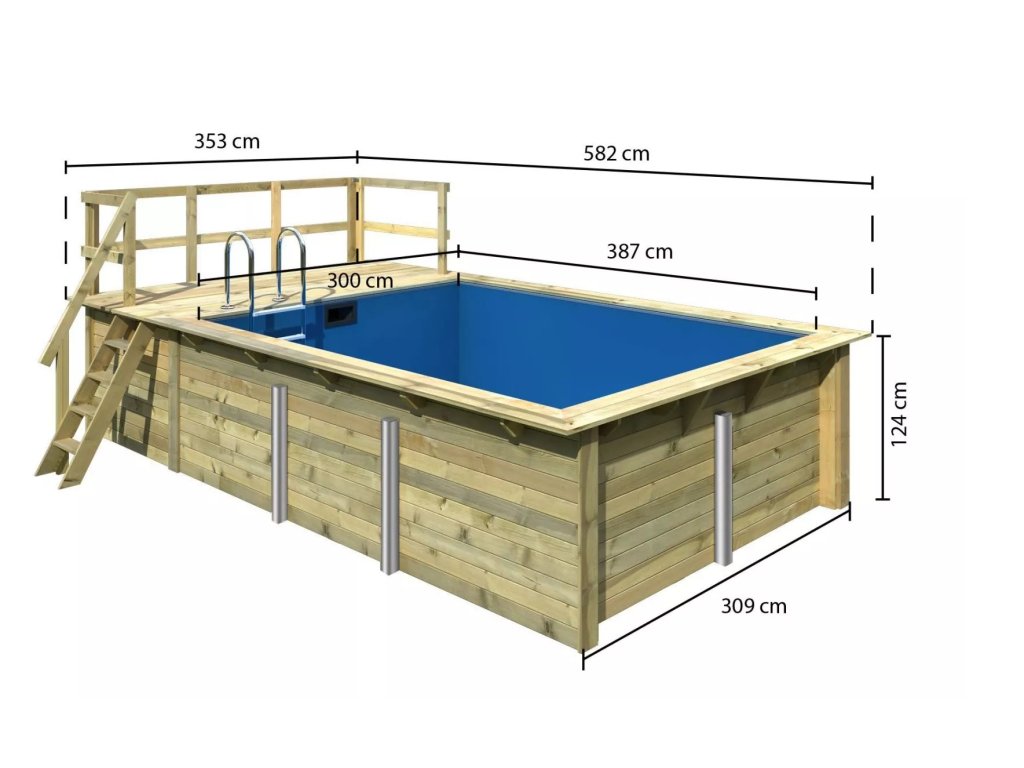 Hledáte dokonalý letní zážitek pro celou rodinu? Pořiďte si bazén KARIBU model 2A a užijte si letní radovánky bez konce, od prémiového německého výrobce Karibu Holztechnik GmbH. Představte si horký letní den, slunce pálí a vy toužíte po osvěžení. S bazénem KARIBU model 2A se váš sen stane realitou. Vychutnejte si chladivou vodu a unikněte letnímu vedru v pohodlí vlastní zahrady. Bazén KARIBU model 2A s rozměry 3,53 x 5,82 m nabízí dostatek prostoru pro hry a zábavu pro celou rodinu. Děti mohou dovádět ve vodě, zatímco vy si budete užívat relaxaci na lehátku s osvěžujícím koktejlem v ruce. Bazén KARIBU model 2A má objem pro cca 12 700 litrů vody a výšku hladiny max. 1,11 m. Obsahem balení je vnější dřevěný žebřík ze severského smrku a žebřík z nerezové oceli vám usnadní vstup do chladné vody. Bazénová terasa 3,50 x 1,42 m s integrovanou technickou místností. Konstrukce bazénu je z dřevěných profilů se systémem dvojité pero / drážka o síle 44 mm. Vnitřní prostor je vyplněn pevnou modrou PVC fólií o tloušťce 0,6 mm. Speciální tlaková impregnace KDI třídy 4 - bazén lze instalovat do země. Bazén KARIBU model 2A se snoubí s nejlepší funkčností a jedinečným designem. Vyznačuje se vysokou úrovní dílenského zpracování.