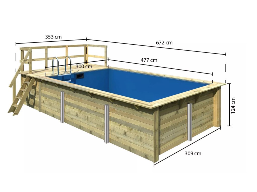 Zaplavat si v chladivé vodě, odpočinout na lehátku a příjemné chvilky zapít lahodným koktejlem. Pro většinu z nás to zní jako perfektní letní den. A takový den můžete prožít i ve vlastní zahradě. S našimi bazény se tyto vaše sny stanou reálnou skutečností. Díky svým rozměrům 353 x 672 cm zábavu a hry pro celou rodinu. Bazén má objem pro cca 15 500 litrů vody a výšku hladiny max. 111 cm. Vnější dřevěný žebřík ze severského smrku a žebřík z nerezové oceli vám usnadní vstup do chladné vody (obojí je obsahem základního balení).