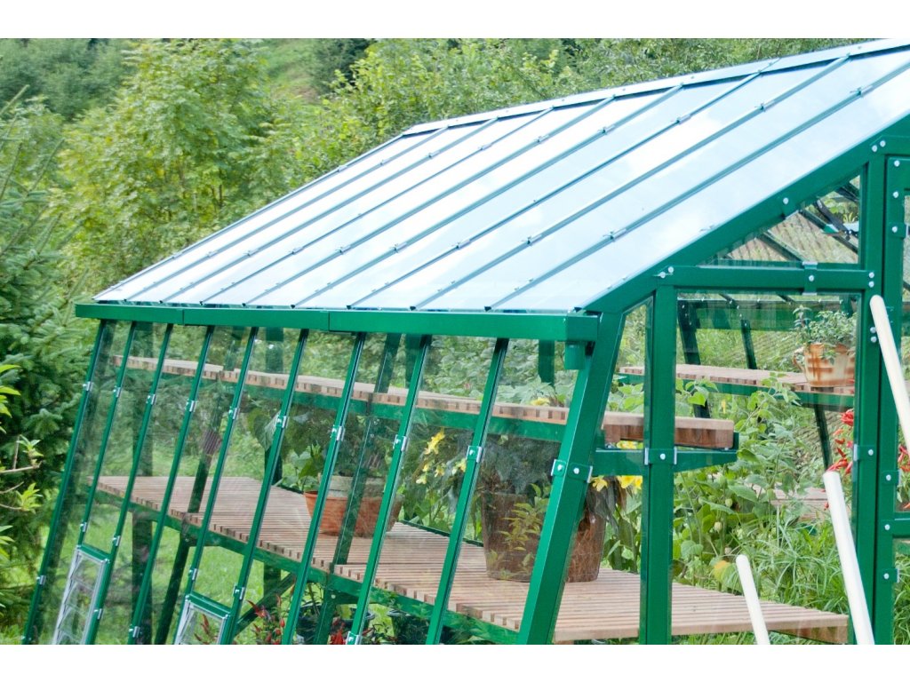 Robustní zahradní skleník s barevným lakováním již v základu vyrobený v České republice se šířkou 4,24 m s šikmými stěnami. Z polykarbonátu o síle 8...