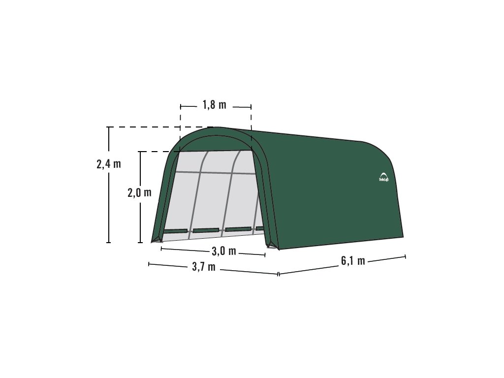 Plachtová garáž - přístřešek amerického výrobce ShelterLogic s rozměry  š 3,70 x d 6,10 x v 2,40 m a zastavěnou plochou 22,57 m2. Konstrukce z ocelových trubek o průměru 35 mm opatřených prémiovou antikorozní úpravou. Šedozelená plachta z třívrstvého tkaného zeleného polyethylenu s UV filtrem. Vyrobeno v USA.