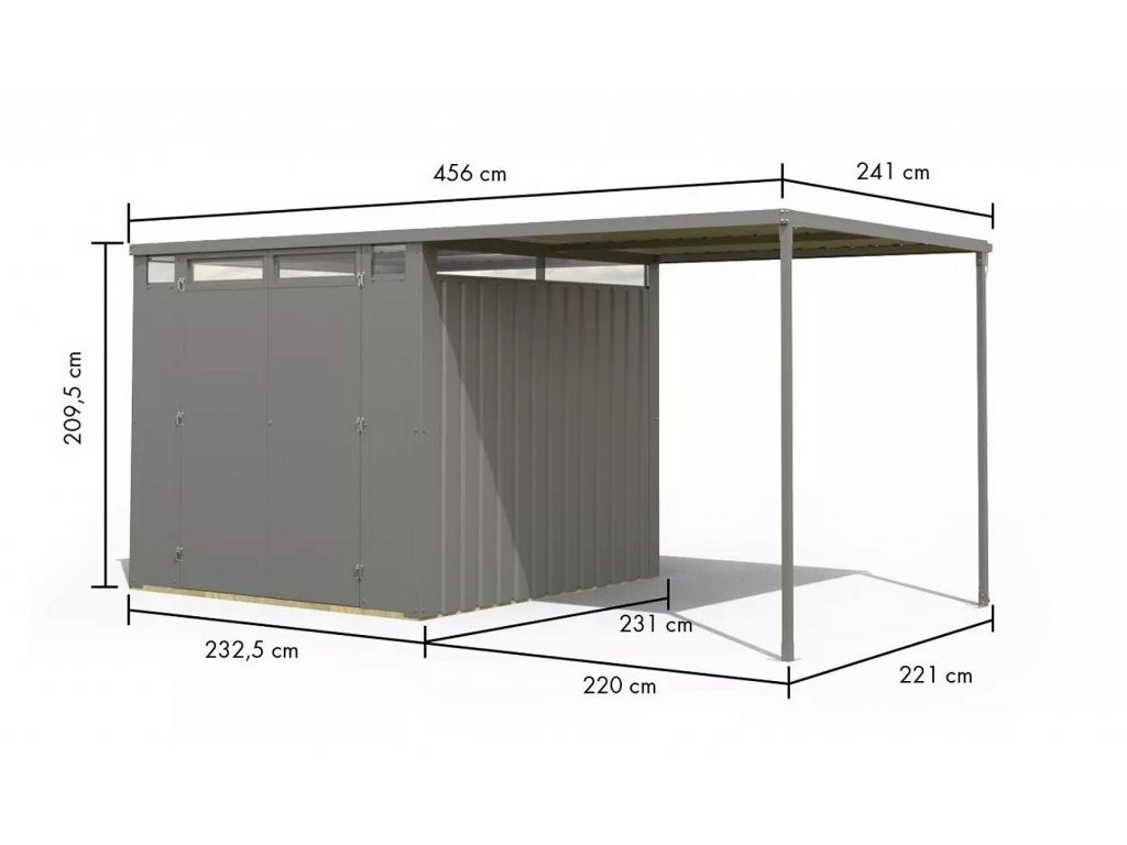 Zahradní kovový domek nejvyšší kvality o rozměru š 4,52 / 2,32 x d 2,31 x v 2,10 m v šedé barvě s otevřeným přístavkem 2,25 m. Vyrobený z práškově lakovaného trapézového plechu o síle 0,5 mm a robustního rámu z pozinkované ocelové čtyřhranné trubky. Celoplošný světelný pás z umělého skla. Okapový žlab. Dvojité křídlové dveře. Cylindrický zámek se 2 klíči. 5 let záruka proti prorezavění.