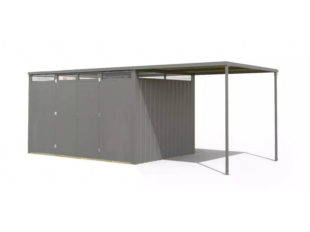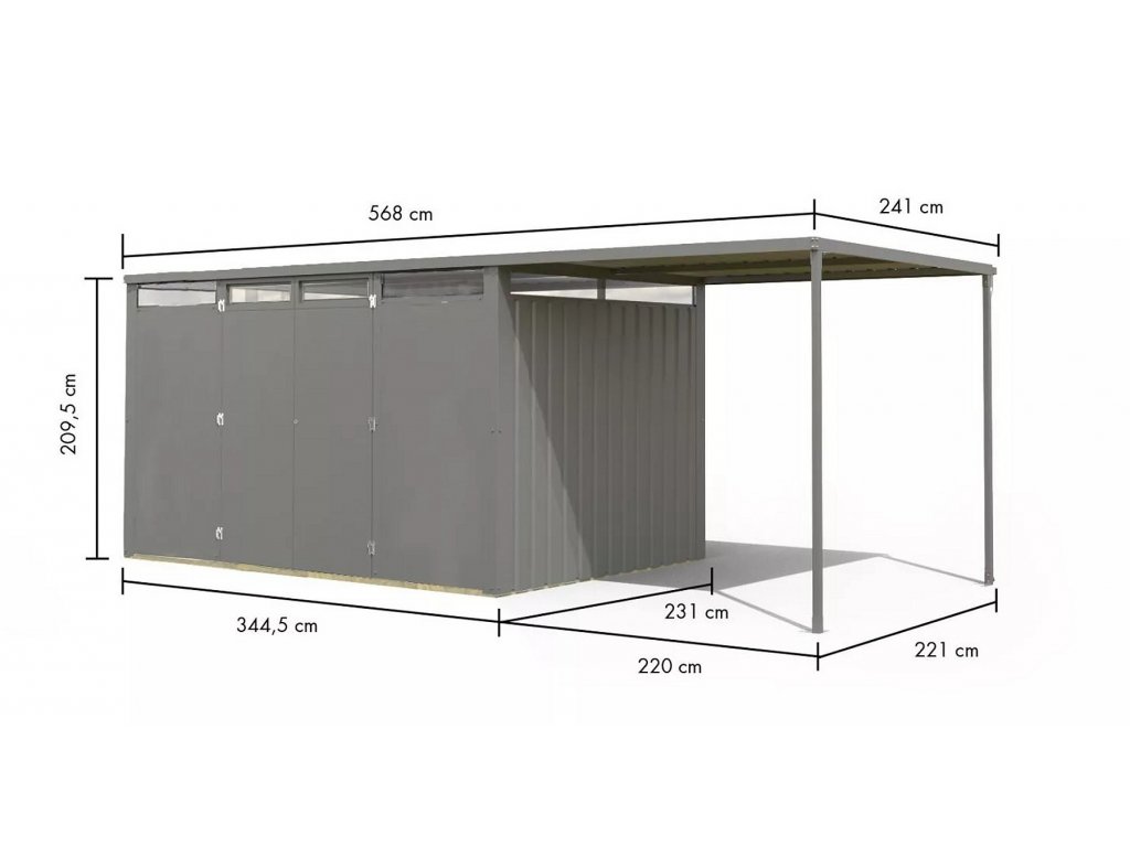 Zahradní kovový domek nejvyšší kvality o rozměru š 5,64 / 3,44 x d 2,31 x v 2,10 m v šedé barvě s otevřeným přístavkem 2,25 m a plochou střechou se sklonem 0,5o. Domek KARIBU CALLISTO 3 je vyrobený z práškově lakovaného trapézového plechu o síle 0,5 mm a robustního rámu z pozinkované ocelové čtyřhranné trubky. Zahradní domek je teda velice odolný a chráněný před povětrnostními vlivy. Trapézový plech je opatřený poctivě aplikovanou práškovou barvou, která dodává estetický nádech, ale i zajišťuje trvanlivost a spolehlivost. Celoplošný světelný pás z umělého skla v horní části domku poskytuje přirozené osvětlení interiéru a vytváří příjemnou atmosféru. Zahradní domek obsahuje okapový žlab, který účinně odvádí vodu.