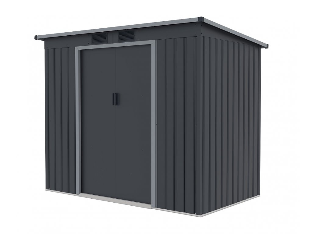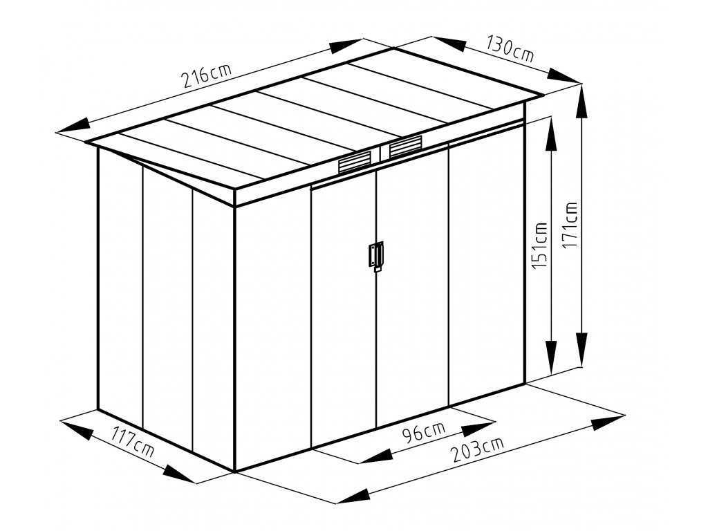 Špičkoví a praktický kovový zahradní domek s pultovou střechou. Konstrukce z pozinkovaného profilovaného plechu s vysokou pevností a tloušťkou stěny 0,22 - 0,35 mm. Vysoká tloušťka stěny zajišťuje odolnost a dlouhou životnost. Odolný domek HALLE 74 od renomovaného výrobce Lanit Plast může sloužit jak pro rekreaci, tak i pro uschování nářadí, zahradní techniky a zahradního nábytku. Čelní vnitřní posuvné dvoukřídlé dveře o rozměru 96 x 151 cm umožňuji snadný přístup do domku. Pultová střecha umožňuje efektivní odvod dešťové vody.