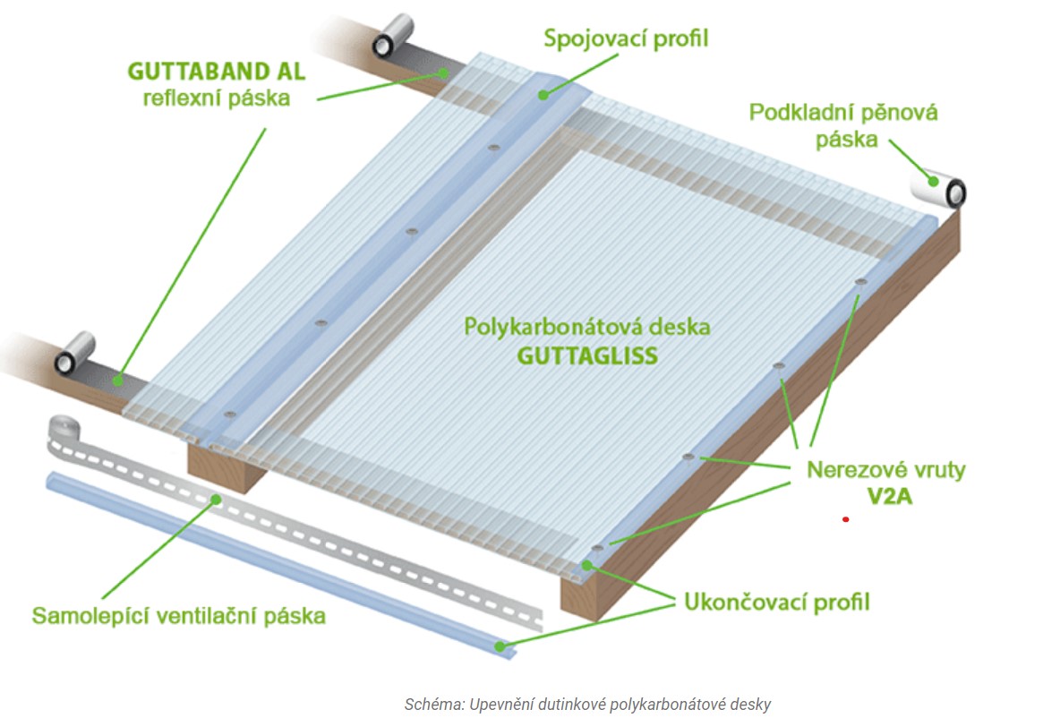 Před instalaci dutinkových polykarbonátových desek je nutné připravit nosnou dřevěnou konstrukci. Doporučujeme krokve široké minimálně 60 mm, ideálně 80 mm, kontralatě mohou být menší. Krokve jsou trámky nebo fošny rovnoběžné se směrem, ve kterém teče po střeše dešťová voda. Kontralatě na pergole jsou kolmé ke směru, ve kterém teče po střeše dešťová voda. Sklon střechy by mněl být 10° (minimálně 7°), z důvodu odtoku dešťové vody a samočistícího efektu desek dešťovou vodou. Následně na krokve nalepte fólii Guttaband AL nebo podkladní pěnovou pásku. Otevřené okraje polykarbonátových desek přelepte ventilační páskou, aby nedocházelo k vnikání nečistot. Páska zamezuje vsakování vlhkosti do dutinek desky, kde se tak následně neusazují nečistoty a netvoří se plíseň. Při instalaci dutinkových polykarbonátových desek se orientace dutinek instaluje ve směru spádu, aby odtok vody byl po spádu k ventilační pásce. Polykarbonátovou desku s nasazeným spojovacím profilem položte na krokve a upevněte vruty V2A. Na druhý okraj polykarbonátové desky nasaďte podélný ukončovací profil. Na příčné okraje desek s ventilační páskou nasaďte ukončovací profily: ukončovací lištu Guttaprofil PC-U nebo Guttaprofil ALU-U elox nebo Guttaprofil ALU-U elox s okapničkou. Sejměte ochranné fólie z celé plochy polykarbonátové desky. Řezání doporučujeme provádět ruční pilkou na železo, kotoučovou pilou s rozbrušovacím diamantovým kotoučem nebo úhlovou bruskou - flexou. Další možnost řezání je pomoci odlamovacího nože u desky do tloušťky 10 mm.