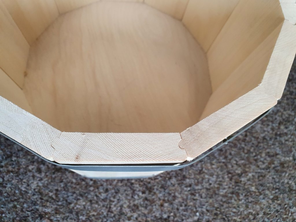 Saunové vědro vyrobené ze smrkového dřeva z 12 profilových prken s dvěma uchy bez plastové vložky, určené k polévání saunových kamenů. Profily jsou možné stáhnout dvěma plechovými pásky. Objem 10 L.