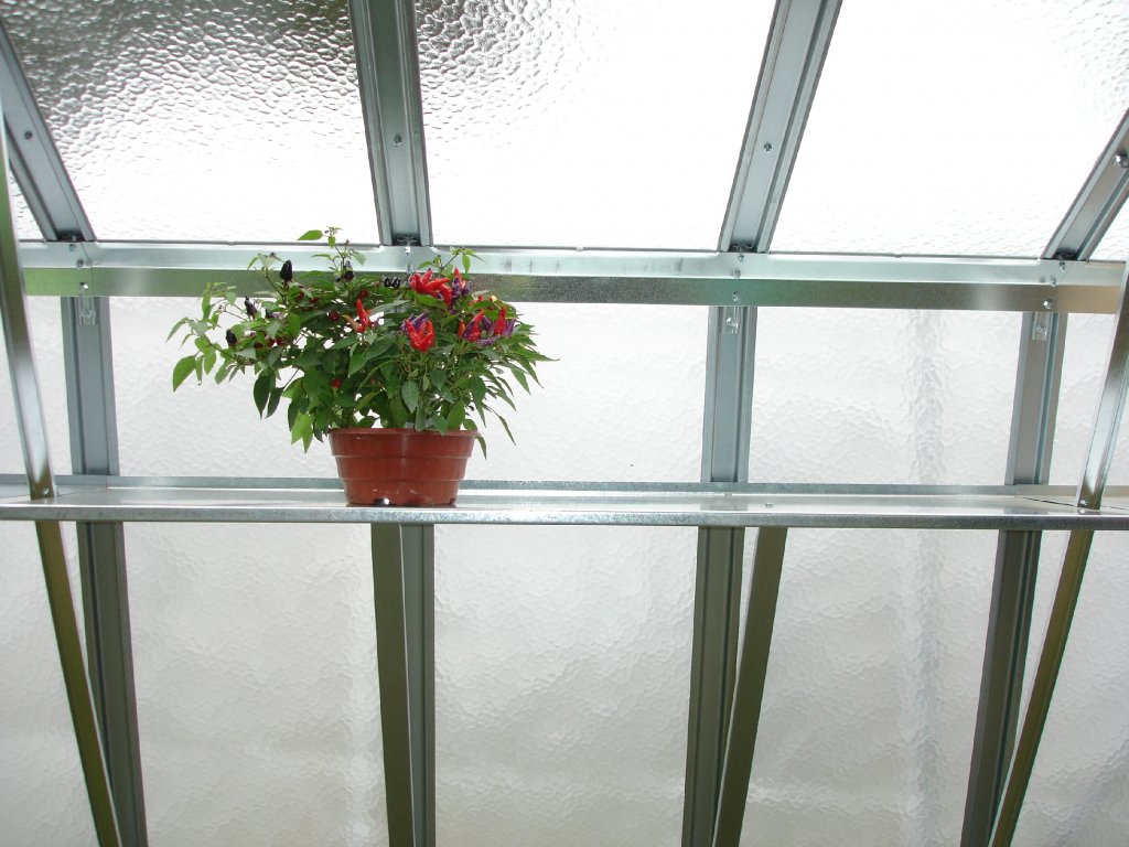 - Police z pozinkovaného plechu o síle 1 mm určená pro skleníky Limes Variant L a Limes Variant C