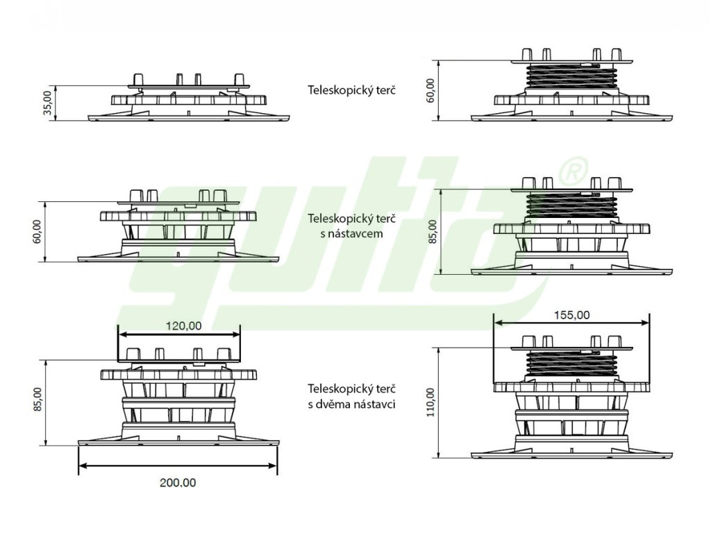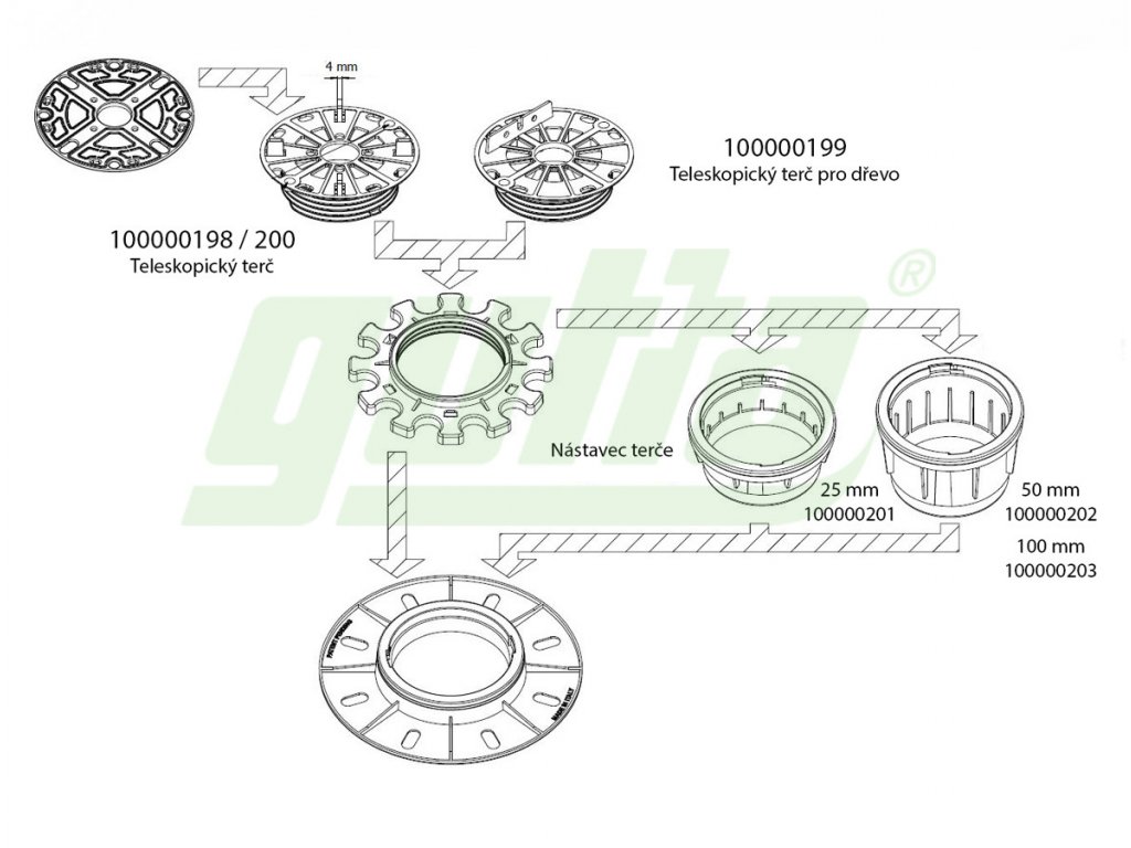 Teleskopický terč pro dřevo určený pod WPC podlahy s vymezovací příčkou a možností nastavení výšky od 35 do 60 mm pomocí stavitelného závitu. Terče slouží pro podporu podkladního hranolu a následnou instalaci WPC prken. Teleskopický terč pro dřevo je určený pro suché kladení podkladových profilů na zpevněný podklad. Pro vyrovnání výškového rozdílu terče obsahují závit. Po vyšroubování na požadovanou výšku teleskopický terč zaaretujete objímkou. K terčům můžete doobjednat nástavce, díky kterým můžete nastavit téměř libovolnou výšku.