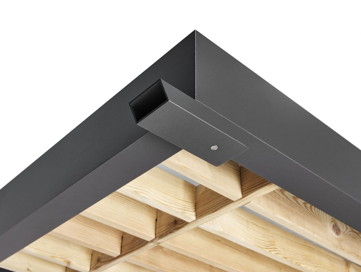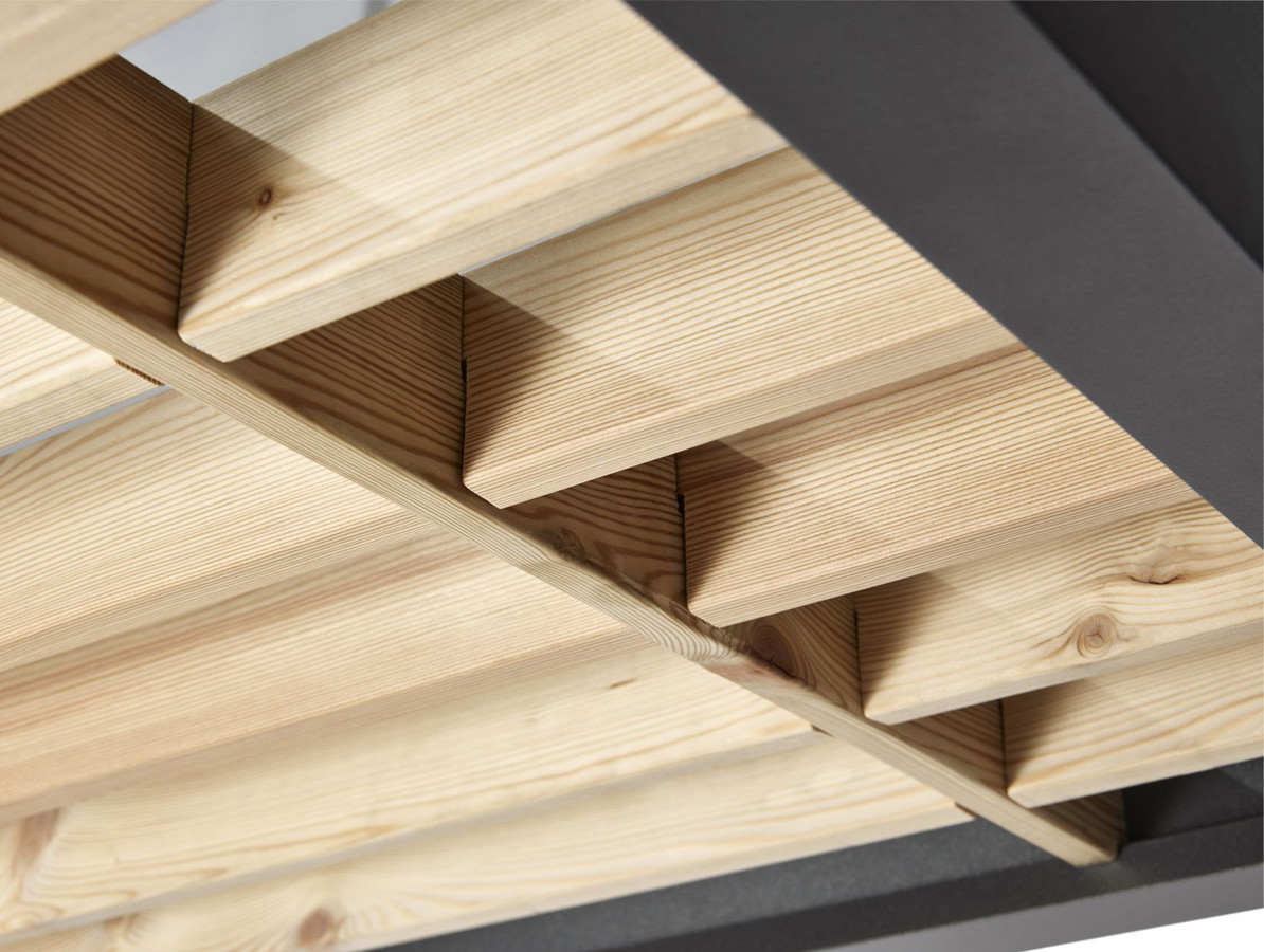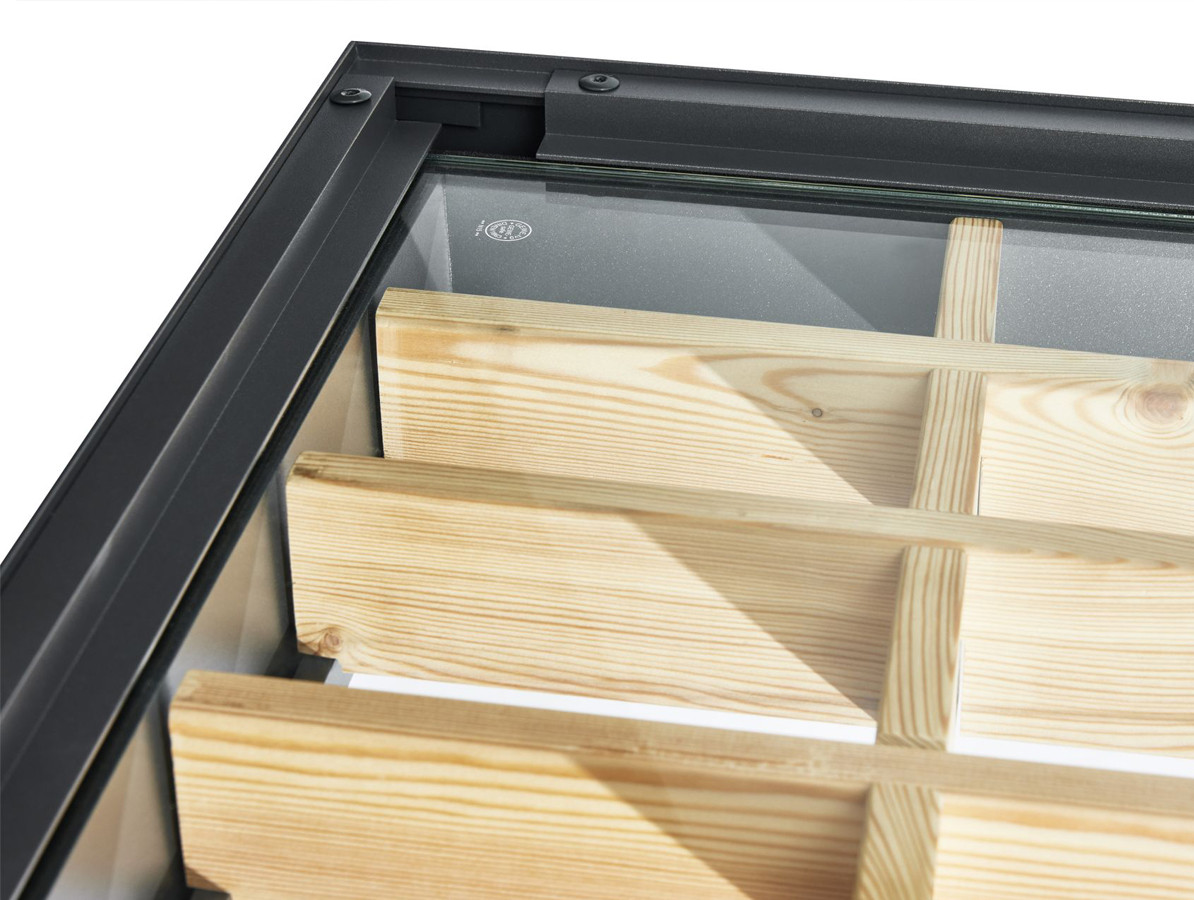 Hliníkový rám je vyrobený z práškově lakovaného hliníku v nadčasové matné, antracitové barvě s odstínem (DB 703). Jemný strukturální lak nejvyšší kvality je v kontrastu k teplé barvě dřeva.