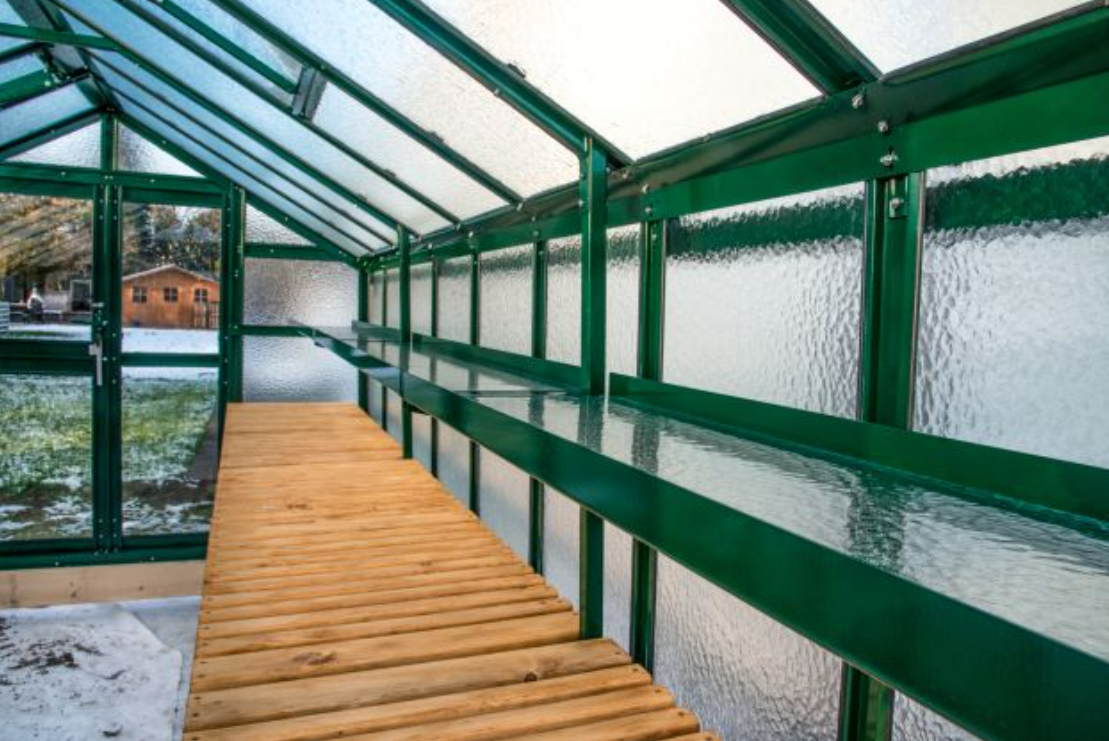 Český, robustní zahradní skleník s barevným lakováním již v základu se šířkou 2,12 m se šikmými stěnami z polykarbonátu o síle 8 mm. 1x dvoukřídlé dveře...