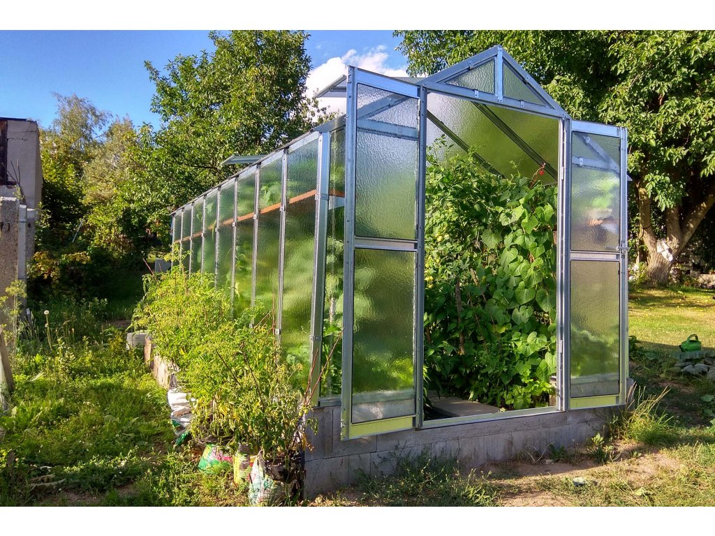 Robustní, český zahradní skleník se šířkou 4,24 m se šikmými stěnami z matného skla s efektem rozptýlení slunečních paprsků nebo čirého skla o síle 4 mm. 4 x...