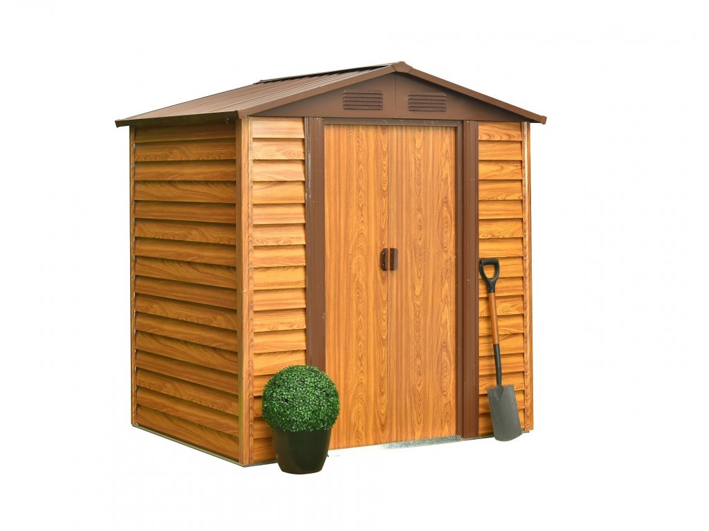 Kvalitní plechový zahradní domek s klasickou sedlovou střechou a čelními posuvnými dveřmi v barvě dřevodekor. Zahradní domek MAXTORE je vyrobený z kvalitního elektrolytického pozinkovaného vodorovně profilovaného plechu s žárově nanesenou barvou a sílou stěny 0,25 mm. Tloušťka nosné konstrukce je 0,6 mm. Zahradní domky mohou sloužit jak pro rekreaci, tak i pro uschování nářadí, zahradní techniky a zahradního nábytku nebo i jako domeček pro děti. Zahradní domek MAXTORE je vhodný k uskladnění zahrádkářských, grilovacích, campingových, bazénových, sportovních a motoristických potřeb... Kovový domek má čelní vnitřní posuvné dvoukřídlé dveře o rozměru v 84 x v 171 cm. Jak na čelní tak i zadní straně zahradního domku jsou pro dostatečné odvětrávání osazeny ventilační mřížky. Zahradní domek MAXTORE je připraven k zabezpečení pomocí visacího zámku.