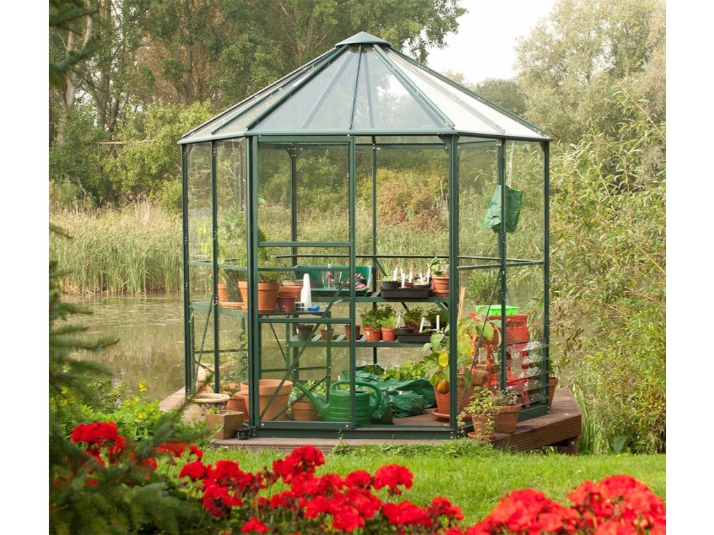 Prémiový hliníkový šestistěnný pavilon od renomovaného výrobce VITAVIA GARDEN LTD z Velké Británie. Pavilon je vyrobený z eloxovaných hliníkových profilů o průměru v nejdelších bodech 2,56 m a mezi stěnami 2,3 m v zelené barvě a až 2,57 m s vnější výškou. Zasklení stěn z čirého bezpečnostního skla o síle 3 mm, zastřešení střechy z vysoce kvalitního polykarbonátu o síle 6 mm. Boční stěny jsou zasklené sklem, které je uchycené pomocí zaklapávací lišty, polykarbonát na střeše je do hliníkových profilů uchycen pomocí ocelových sponek. Prémiový hliníkový pavilon s jednokřídlými posuvnými dveřmi, 1 x výklopným ventilačním okénkem a pozinkovanou lakovanou ocelovou základnou s výškou 6 cm.
