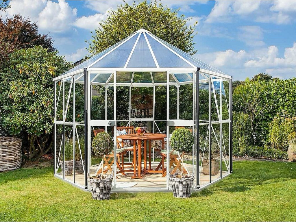 Prémiový hliníkový šestistěnný pavilon od renomovaného výrobce VITAVIA GARDEN LTD z Velké Británie. Pavilon je vyrobený z eloxovaných hliníkových profilů o průměru v nejdelších bodech 3,8 m a mezi stěnami 3,2 m ve stříbrné barvě a až 3 m s vnější výškou. Zasklení stěn z čirého bezpečnostního skla o síle 3 mm, zastřešení střechy z vysoce kvalitního polykarbonátu o síle 6 mm. Boční stěny jsou zasklené sklem, které je uchycené pomocí zaklapávací lišty, polykarbonát na střeše je do hliníkových profilů uchycen pomocí ocelových sponek. Prémiový hliníkový pavilon s dvoukřídlými posuvnými dveřmi, 3 x výklopným ventilačním okénkem a pozinkovanou lakovanou ocelovou základnou s výškou 6 cm.